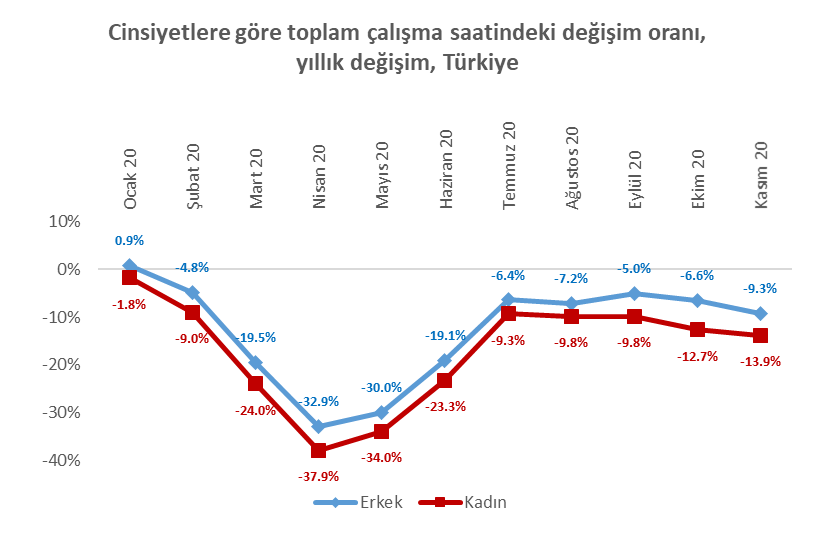 İşgücüne ilişkin veriler, pandeminin yarattığı istihdam kaybından ise yine kadınların daha fazla etkilendiğini ortaya koymakta. Türkiye genelinde kısıtlamalara paralel olarak Nisan 2020 itibarıyla, toplam çalışma saatinde geçen yılın aynı dönemine göre %34,3 oranında kayıp yaşandı. Veriler cinsiyet ayrımında incelendiğinde, kadın çalışanların çalışma saatlerinin %37,9 azalırken, erkek işçilerin toplam çalışma saatlerinin %32,9 gerilediği görüldü. Kadın çalışanların çalışma saatlerindeki kaybın, kadın çalışanların ücretlerinde yaratabileceği olası olumsuz etkiler önümüzdeki süreçte takip edilecek.