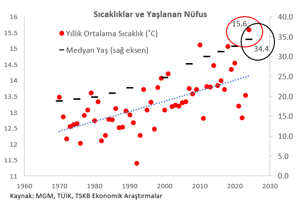 Artan sıcaklıkların sağlık üzerinde yarattığı risklerin yanı sıra etkisinin simetrik dağılmaması da konuyu bir başka boyuta taşıyor. Aşırı sıcaklıklara bağlı ölüm riskinin yaş faktörünün dikkate alınması ile sayısal olarak arttığını gösteren bilimsel çalışmalar mevcut.3 Bir yandan yer küre ısınırken bir yandan da dünya nüfusu yaşlanıyor. Ülkemizde de durum farklı değil; Türkiye’de 2008 yılında yıllık nüfus artışı binde 13,4 iken 2024 yılında artış oranı binde 3,1’e geriledi. Türkiye’de medyan yaş giderek yükseliyor: 2000 yılında 24,8 iken 2024 yılına gelindiğinde 34,4 olarak ölçüldü. TÜİK, 2024 yılı itibariyle 65 yaş üstü nüfusun toplam nüfustaki payını %11 olarak hesaplarken bu oranın 2050’de %23,1 ve 2100’de ise %33,6 olmasını öngörüyor.