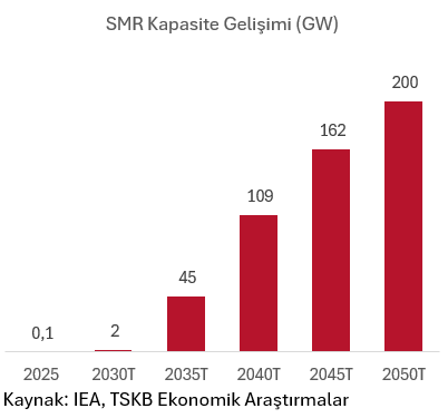 Dünya Nükleer Enerji Örgütü’ne göre tüm dünyada biri Çin’de ikincisi de Rusya’da olmak üzere toplam 140 MW kapasiteye sahip iki adet SMR işletmede[2]. Bununla birlikte yine aynı verilere göre toplam 129 adet SMR inşaat ve planlama aşamasında. Yani yakın dönemde çok daha fazla sayıda SMR enerji arzında aktör olacak. Uluslararası Enerji Ajansı (IEA) 2025 yılında yaptığı bir çalışmada 2050 yılında net sıfırı hedefleyen senaryosunda SMR’ların 2050 yılında 200 gigavat (GW) kapasiteye ulaşabileceğine işaret ediyor.