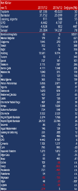 Borsa İstanbul’da hisseleri işlem gören firmaların 2017 yılı toplam net karları geçen yılın aynı dönemine göre %50 gibi yüksek bir artışla 67,3 milyar liraya yükseldi. İncelediğimiz 40 sektörün sadece 3 tanesi dönemi zararla kapattı. Bankaların karları %27 artışla 25,1 milyar liradan 31,7 milyar liraya, sanayi şirketlerinin karları %78 artışla 14,2 milyar liradan 25,3 milyar liraya yükseldi. Kâr artışının sanayi şirketleri önderliğinde gerçekleşmiş olması, iç ve dış talebin gücünün üretim artışına dönüştüğünü gösteriyor. 2017’de büyümenin desteklenmesi için alınan tedbirler sanayi sektörünü destekledi.