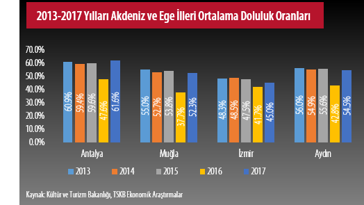 Yıllar itibarıyla ziyaretçi hacmindeki büyümeyle birlikte benzer tipte turizm yatırımlarına hız kesmeden devam edilmesine bağlı olarak genel doluluk oranları benzer seviyelerini koruyor (2016 yılı hariç).