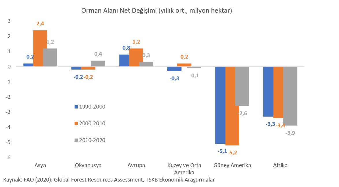 Birleşmiş Milletler Gıda ve Tarım Örgütü’nün (FAO) çalışması¹ ormansızlaşmanın boyutlarını gözler önüne seriyor. 1990-2000 döneminde dünyada yıllık ortalama 7,8 milyon hektarlık orman alanı kaybı olduğu görülüyor. 2010-2020 dönemine gelindiğinde bu rakamın yıllık 4,7 milyon hektara gerilediği görülse de halen oldukça yüksek seviyede olduğu söylenebilir. Ormansızlaşmada ön planda olan bölgeler ise Latin Amerika ve Afrika. Özellikle Afrika’da ormansızlaşma eğiliminin güçlendiği görülüyor.