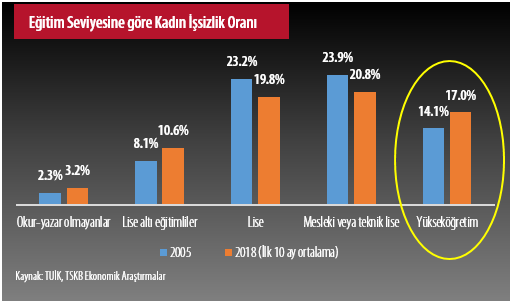 Kadınlarda yaşanan işsizlik problemi eğitim seviyelerine göre değerlendirildiğinde, resim daha net ortaya çıkıyor. Kadınlarda en yüksek işsizlik oranının düz lise ve meslek lisesi mezunlarında olduğu anlaşılıyor. Bu gruba giren kadınlara iş fırsatları yaratma konusunda Türk işgücü piyasaları son yıllarda hiç de kötü bir performans göstermemiş aslında. Diğer taraftan ise, üniversite mezunu kadınlarda ciddi anlamda yükselen işsizlik oranı dikkat çekici. Şunu anlıyoruz ki, yüksek eğitimli kadın işgücü arzına, kamu ve özel sektör yeteri kadar iş sahası yaratamamış. Bunu Türkiye ekonomisinin dönüşümünün, kadın işgücü dönüşümünden daha yavaş gerçekleşmesine bağlayabiliriz.