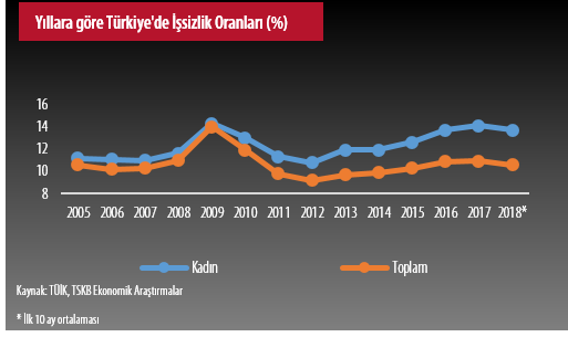 Türkiye, kriz yılları dışında %10 seviyelerindeki işsizlik oranları ile yaşadı ve yaşamaya devam ediyor. Özellikle 2014 yılından sonra işsizlikteki hızlı yükselişin engellenemediği görülüyor. Son gelen makroekonomik veriler de işsiz sayısındaki yükselişin ivme kazanarak devam edeceğinin sinyalini veriyor. Kadınlarda durum daha da ciddi seviyede. 2017 yılında kadın işsizlik oranı kriz döneminde görülen rekor seviyeye yakın (%14,1) gerçekleşti. 2014’den bu yana toplam işsizlik oranı 1 yüzde puan yükselirken, kadın işsizlik oranı tam 2,2 yüzde puan artmış durumda.