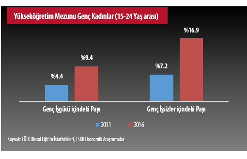İşgücü piyasalarında, özellikle kadınlar için “vasıf uyumsuzluğu” olduğu bir gerçek. Genç nüfustaki yükseköğretim mezunu kadınların işgücü ve işsizlik rakamları içindeki payının kayda değer seviyede artması bu çıkarımı destekliyor. Yükseköğretim görmüş genç kadınların (15-24 yaş arası), 2005’ten bu yana kendi yaş grubundaki işgücündeki payı %9,4’e yükselirken, işsizlikteki payı tam 2,3 katına çıkmış. Genç nüfusta görülen ne eğitimde ne istihdamda olanların (NEET) oranı da, eğitimli kadınlardan üretimde faydalanamadığımızı gösteren diğer bir veri. OECD ülkeleri arasında %24 ile en fazla NEET oranına sahip olan Türkiye’de, genç kadınlarda bu oran %37’ye çıkıyor. Yükseköğretim mezun kadınlar da ise NEET oranı %41.(1)