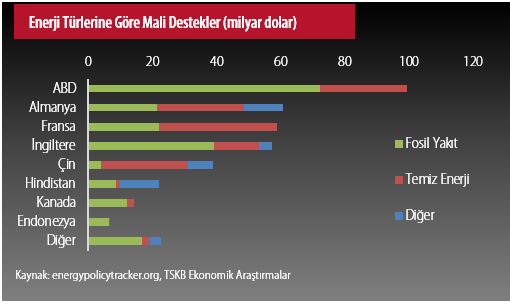 IISD’nin (Internatonal Institute for Sustainable Development) G20 ülkelerinin resmi dokümanlarından yararlanarak derlediği veriler, bu ülkelerde farklı enerji kaynaklarının COVID-19 sonrası ortaya konulan politikalar ile ne kadar desteklendiğini ortaya koyuyor. Çalışma salgının başlangıcından 26 Ağustos tarihine kadar geçen sürede, fosil yakıtlar için hükümetlerin yaklaşık 204 milyar dolarlık bir taahhütte bulunduğunu ortaya koyarken, temiz enerji kaynakları için desteğin 138,6 milyar dolarda kaldığını gösteriyor. Detaylara inildiğinde yalnızca dört ülkenin (Almanya, Brezilya, Çin ve Fransa) bu süre zarfında temiz enerji desteklerini fosil yakıtların önüne koyduğu görülüyor.