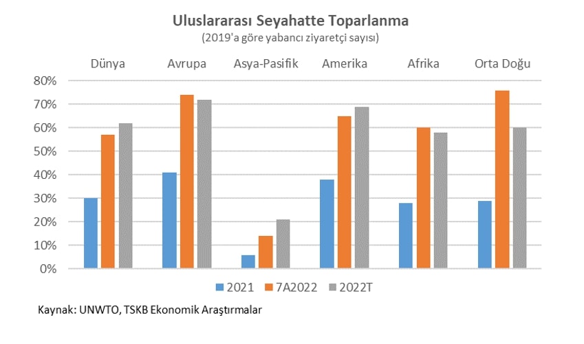 Uluslararası turizm, ziyaretçi sayısı baz alınarak yapılan hesaplamalara göre 2022 yılının ilk 7 ayında salgın öncesi seviyelerin %57’sine ulaşmış durumda. Geçtiğimiz yılın tamamında bu oranın yalnızca %30’da kaldığı göz önünde bulundurulduğunda, talepte önemli oranda toparlanma olduğunu söylemek yanlış olmayacaktır. Ancak bölgeler arasında önemli farklar da bulunuyor. Özellikle Avrupa ve Orta Doğu’nun bölgelerin kendi içerisindeki trafiğin güçlü seyretmesiyle olumlu ayrıştığı, COVID-19 önlemlerine bağlı olarak halen çeşitli düzeyde seyahat engellerinin uygulandığı Asya Pasifik’te ise düzelmenin son derece kısıtlı kaldığı görülüyor. UNWTO’nun Mayıs ayında yayınladığı tahminler dünyada toparlanma eğiliminin süreceği yönünde. Organizasyonun iyimser ve kötümser olmak üzere iki senaryo üzerinden yaptığı tahminlerin orta noktası yıl sonunda salgın öncesi seviyelerin %62’sinin yakalanacağına işaret ediyor.
