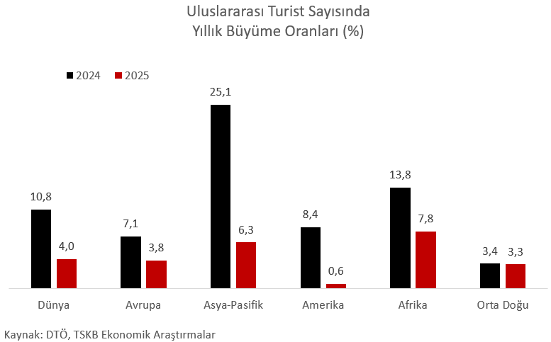 Geride bıraktığımız 2025 yılı, küresel turizm sektörü açısından pandeminin izlerinin tamamen geride bırakıldığı yıl olarak akılda kalacak. 2025’te 1,52 milyar turist uluslararası seyahat gerçekleştirirken, sağlanan yıllık %4’lük büyüme ile hem pandemi öncesi (2019 yılı) kaydedilen turist sayısı ilk kez rekor seviye ile aşılmış oldu hem de 2009-2019 arasını kapsayan dönemde yakalanan %5’lik ortalama büyüme oranına oldukça yaklaşıldı1. Ziyaretçi sayısında Asya-Pasifik (+%6,3) ile Afrika (+%7,8) yakalanan büyümede itici güç olurken, Avrupa %3,8 artış ile dünya geneline yakın bir performans gösterdi. Türkiye’nin de içinde bulunduğu Güney Avrupa ülkelerinde büyüme %3,3’te kaldı. Pandemi sonrası dünya geneline göre daha hızlı toparlanmayı başaran Güney Avrupa’da turist sayısı 2019’a göre %12 daha yüksek kaydedildi. Dünya Turizm Örgütü (DTÖ) 2026’da turist sayısına ilişkin beklentisini %3 ile %4 arasında büyüme yönünde açıkladı. DTÖ’nün sektör paydaşlarıyla gerçekleştirdiği anket de ılımlı bir iyimserliğe işaret ediyor. Öte yandan geçtiğimiz yılı olumsuz yönde etkileyen jeopolitik riskler ve seyahat harcama kalemlerinde izlenen yüksek enflasyon, anket katılımcıları nezdinde 2026 yılında da dünya turizm aktivitesinde aşağı yönlü risk taşıyan unsurlar olarak nitelendirilmeyi sürdürüyor.