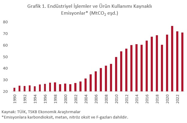 Sanayi sektörü partikül madde, azot dioksit, uçucu organik bileşikler2, sülfür dioksit gibi hava kirleticilerinin en büyük kaynaklarından biri. Ayrıca enerji yoğun sanayi sektörleri sera gazı emisyonlarının da sebepleri arasında yer alıyor.3 Türkiye’de endüstriyel işlemler ve ürün kullanımını kaynaklı sera gazı emisyonlarının 1990 yılındaki 23,1 milyon ton CO2 eşdeğerinden (MtCO2 eşd.), %3,5’lik yıllık bileşik büyüme oranı ile 2023 yılında 71 MtCO2 eşd.’ne ulaştığı görülüyor (Grafik 1).