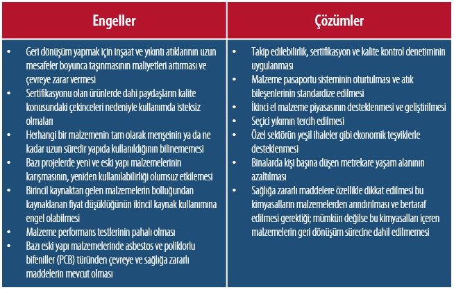 Avrupa Çevre Ajansı’nın (European Environment Agency/EEA) 2018 Nisan ayında yayınladığı rapordan ve IDEA Consult tarafından Avrupa komisyonu için hazırlanan belgeden derlenen inşaat ve yıkıntı atıklarının geri dönüşümü önündeki başlıca engeller ve çözümler şöyle sıralanabilir: