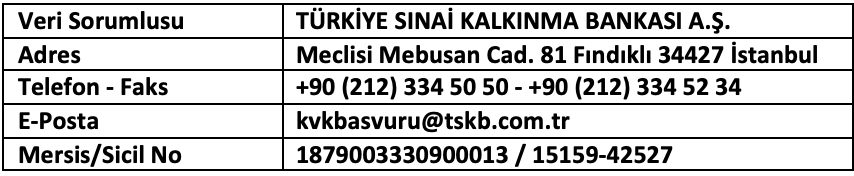 - http://www.tskb.com.tr/i/assets/document/pdf/verisahibibasvuruformu.pdf adresindeki başvuru formunun doldurarak güvenli elektronik imza veya mobil imza imzalanmış dijital suretinin “kvkbasvuru@tskb.com.tr” e-posta adresine göndereceğiniz e-posta ile,