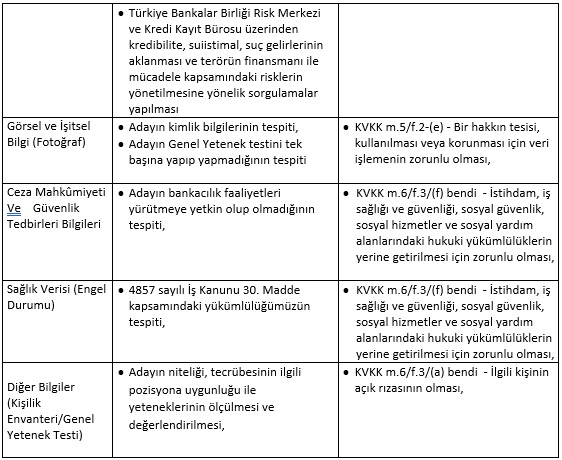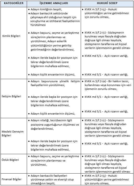 Bankamız tarafından, aday çalışanlara ait olup iş başvurusu süreçlerinde işlenen kişisel veri kategorileri şunlardır: Kimlik Bilgileri, İletişim Bilgileri, Mesleki Deneyim Bilgileri, Özlük Bilgileri, Finansal Bilgiler, Görsel ve İşitsel Kayıtlar, Ceza Mahkûmiyeti Ve Güvenlik Tedbirleri Bilgileri, Sağlık Verileri, Diğer Bilgiler.